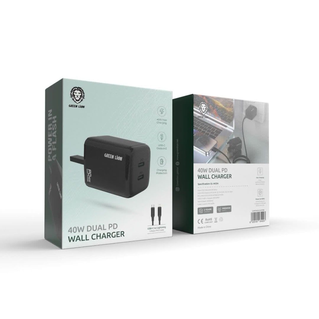 شارژر دیواری پی دی دوگانه 40 واتی با کابل تایپ سی به لایتنینگ گرین Green 40w dual PD wall charger GL-W23A