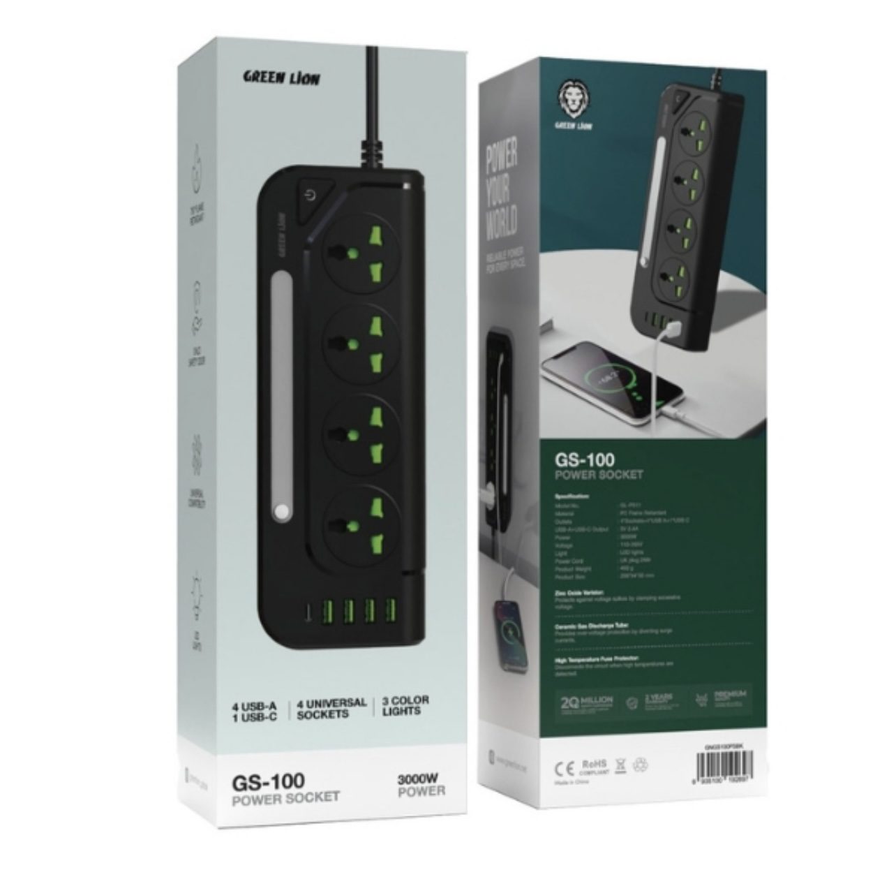 چند راهی برق 3000 وات گرین Green lion GS-100 Power Socket پریز برق شیک و در عین حال بسیار بادوام که از جنس PC مقاوم در برابر آتش و حرارت ساخته شده است .